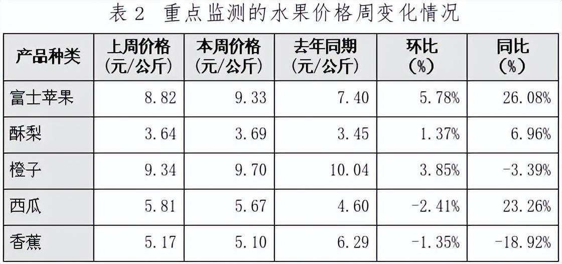本周重点监测的5种水果平均价格为6.70元/公斤,比上周上涨2.13%,同比上涨5.51%(详见表2)。