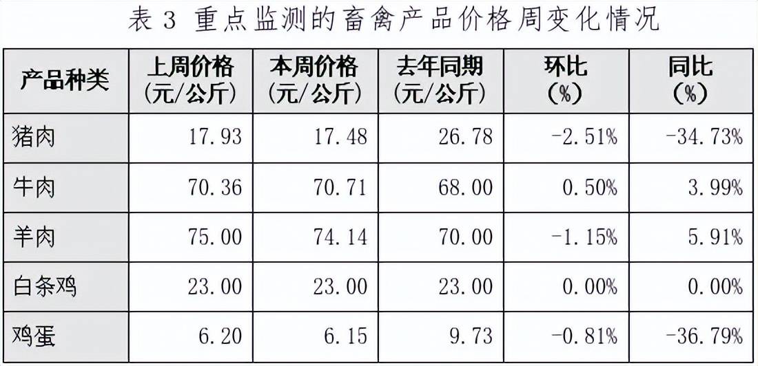 本周重点监测的5种畜禽产品中,牛肉价格比上周上涨0.50%;猪肉、羊肉和鸡蛋价格比上周分别下跌2.51%、1.15%、0.81%;白条鸡价格与上周持平(详见表3)。